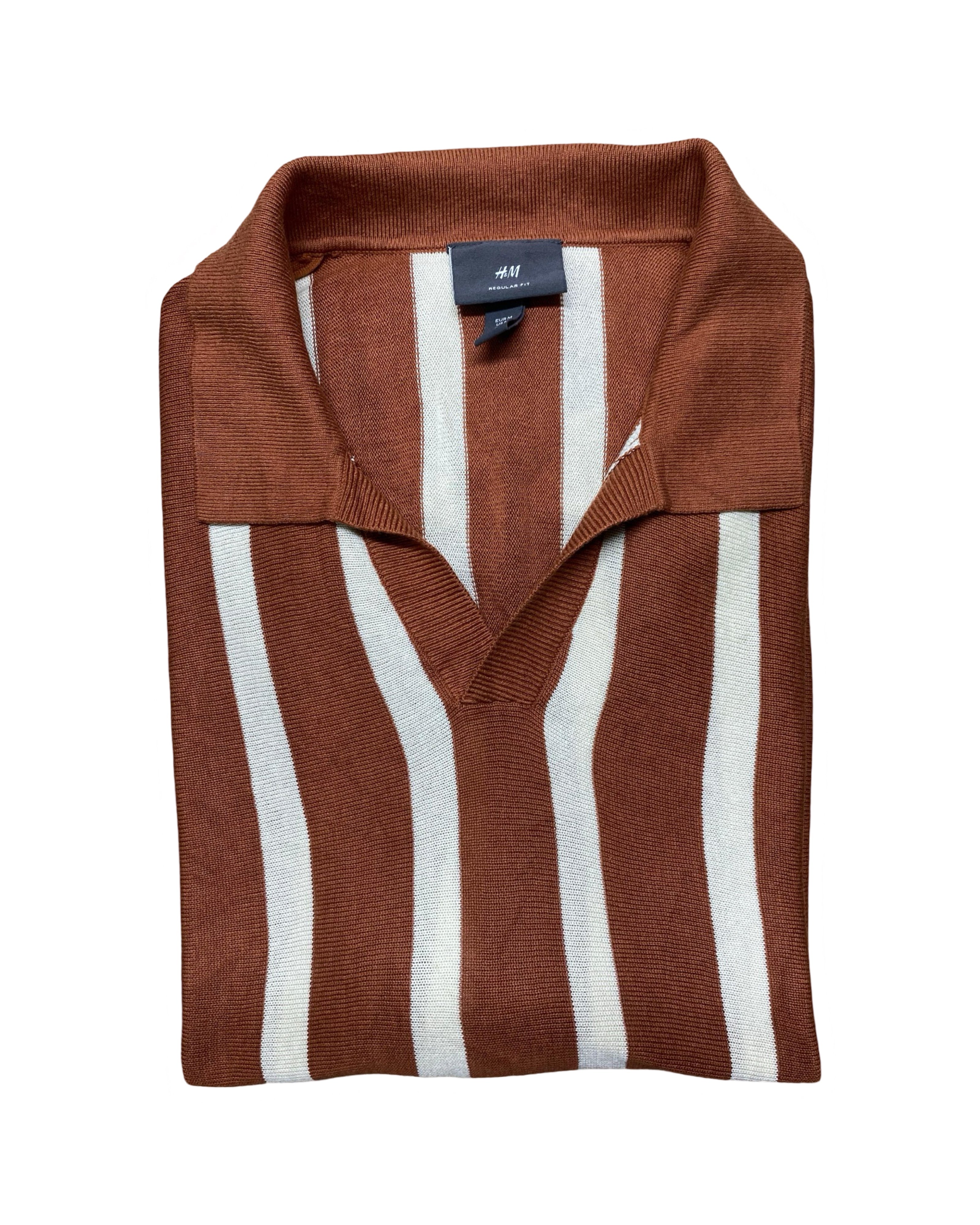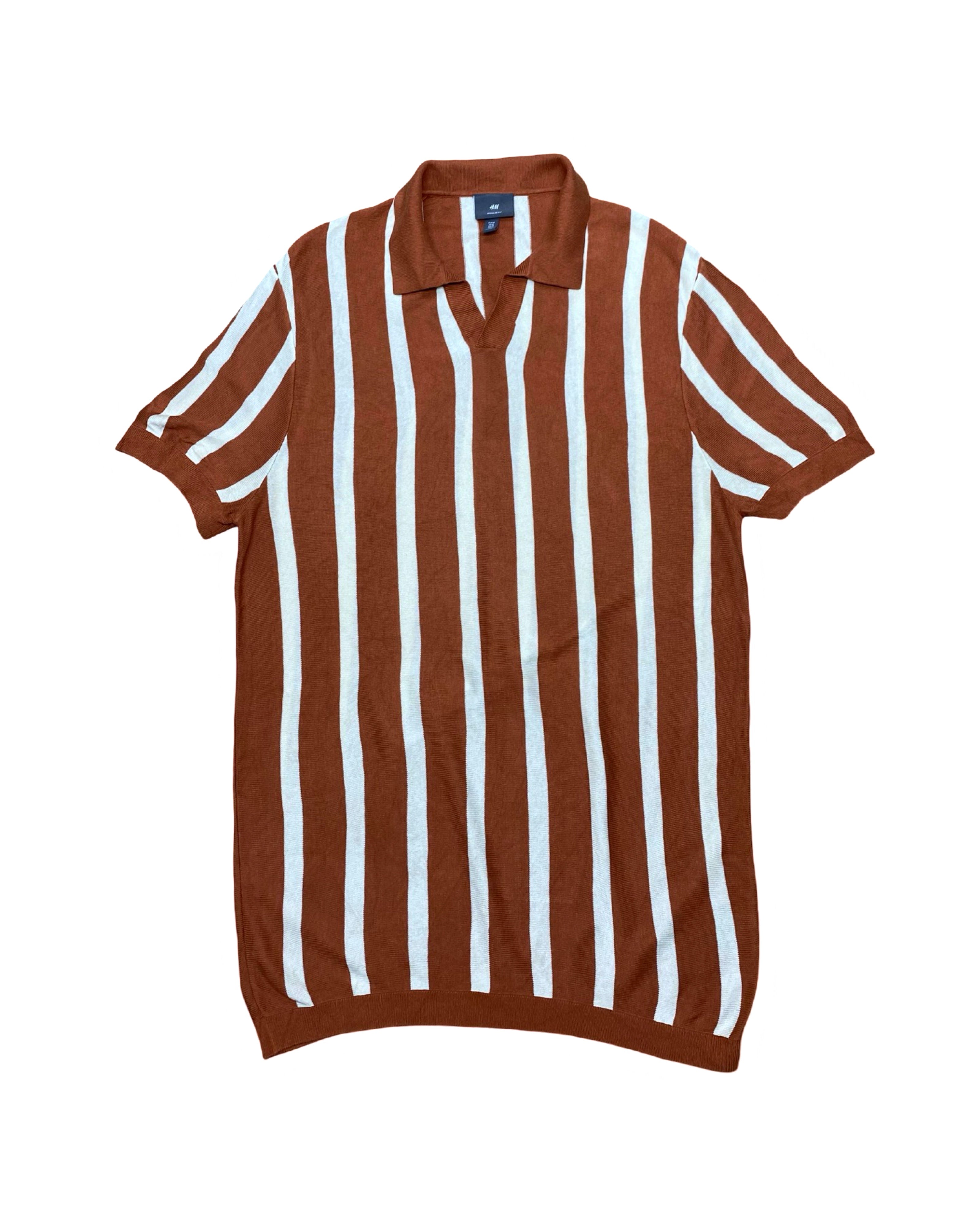 H&M Brown & White Vertical Striped Knitted Polo Shirt | Ribbed Hem | Medium | Chest 21”