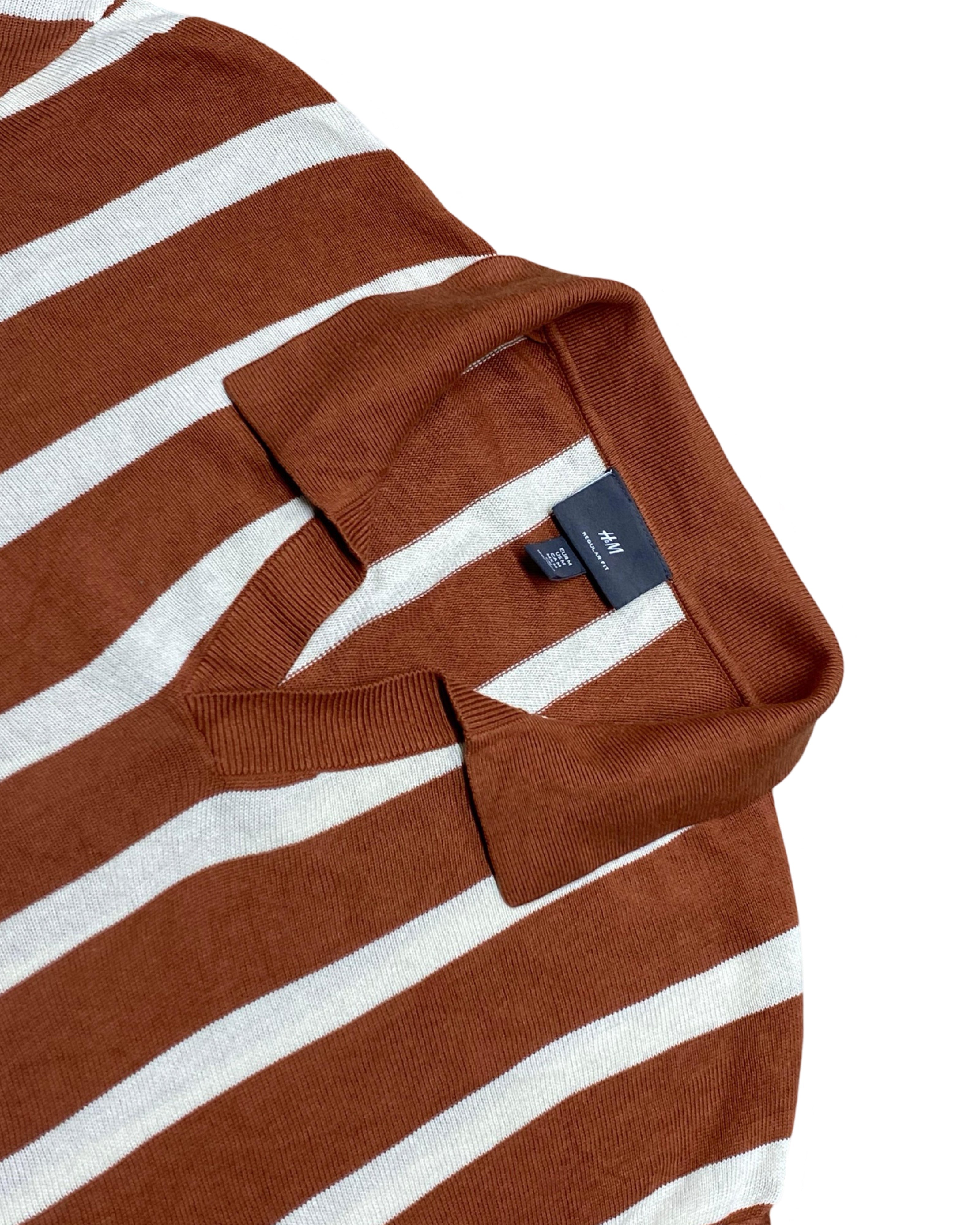 Make a bold statement with this brown and white vertically striped knitted polo shirt from H&M. Featuring a clean open collar design without buttons, it’s a perfect blend of retro flair and modern casual style. The lightweight knit fabric and ribbed hem give it a relaxed yet polished look, ideal for warm-weather layering or standalone wear.