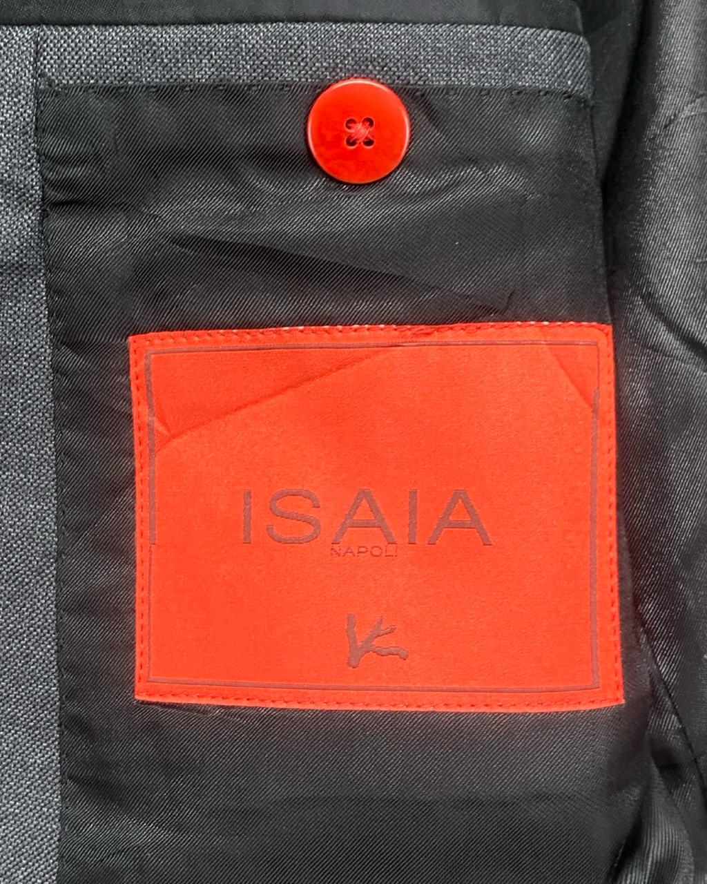 A luxurious Italian-made blazer from Isaia, tailored in a rich charcoal wool with signature red detailing. This premium piece blends Neapolitan craftsmanship with modern sophistication—ideal for refined business or formal occasions.