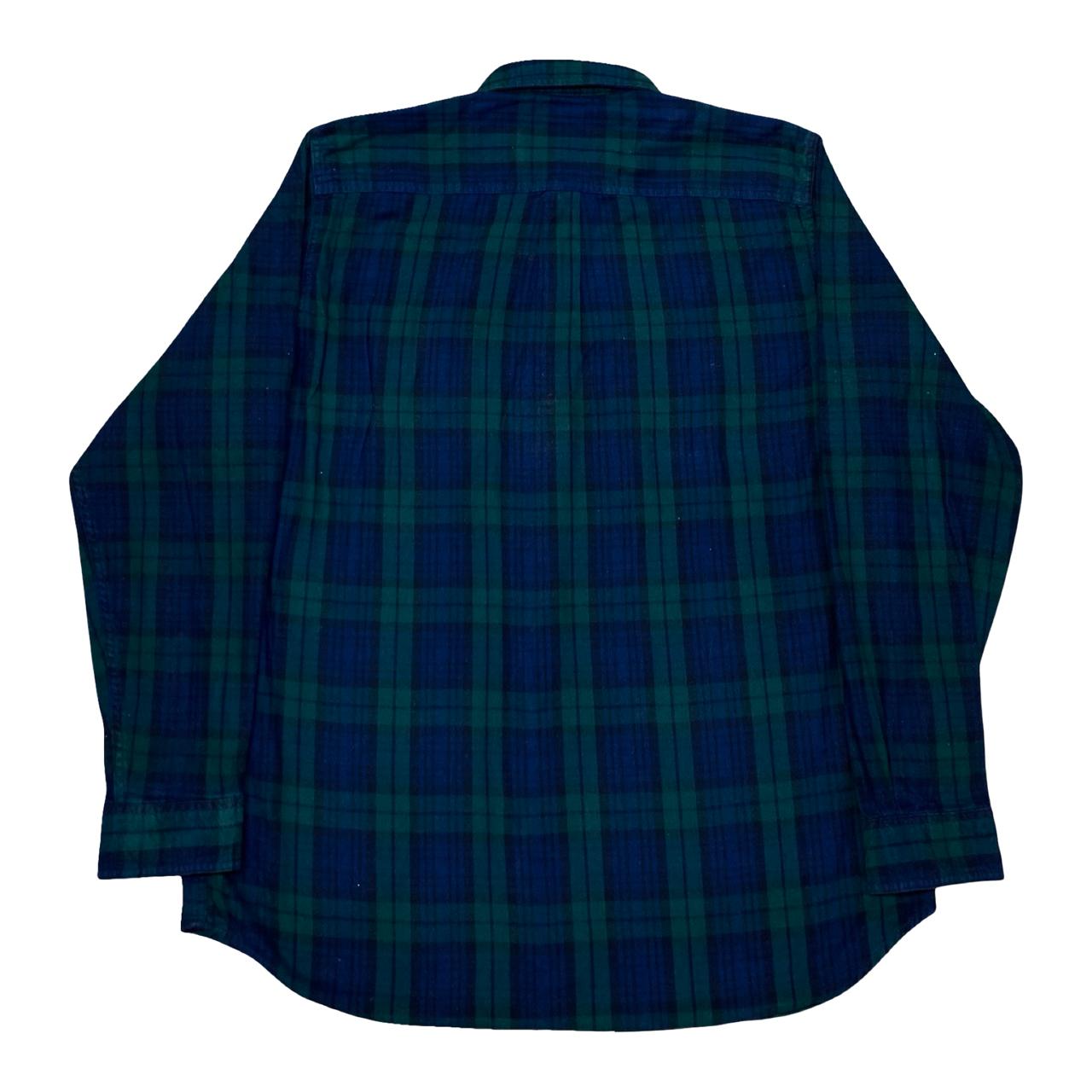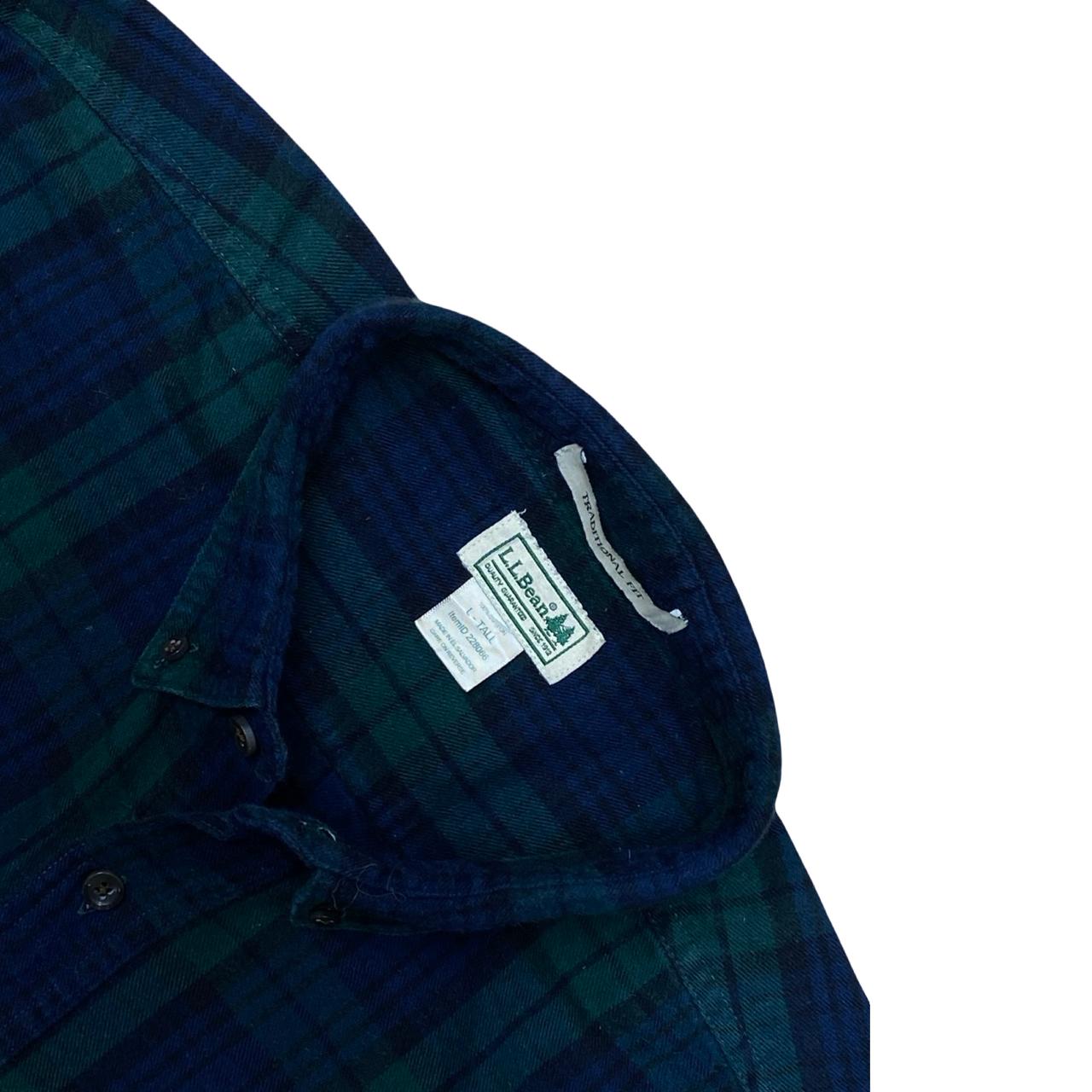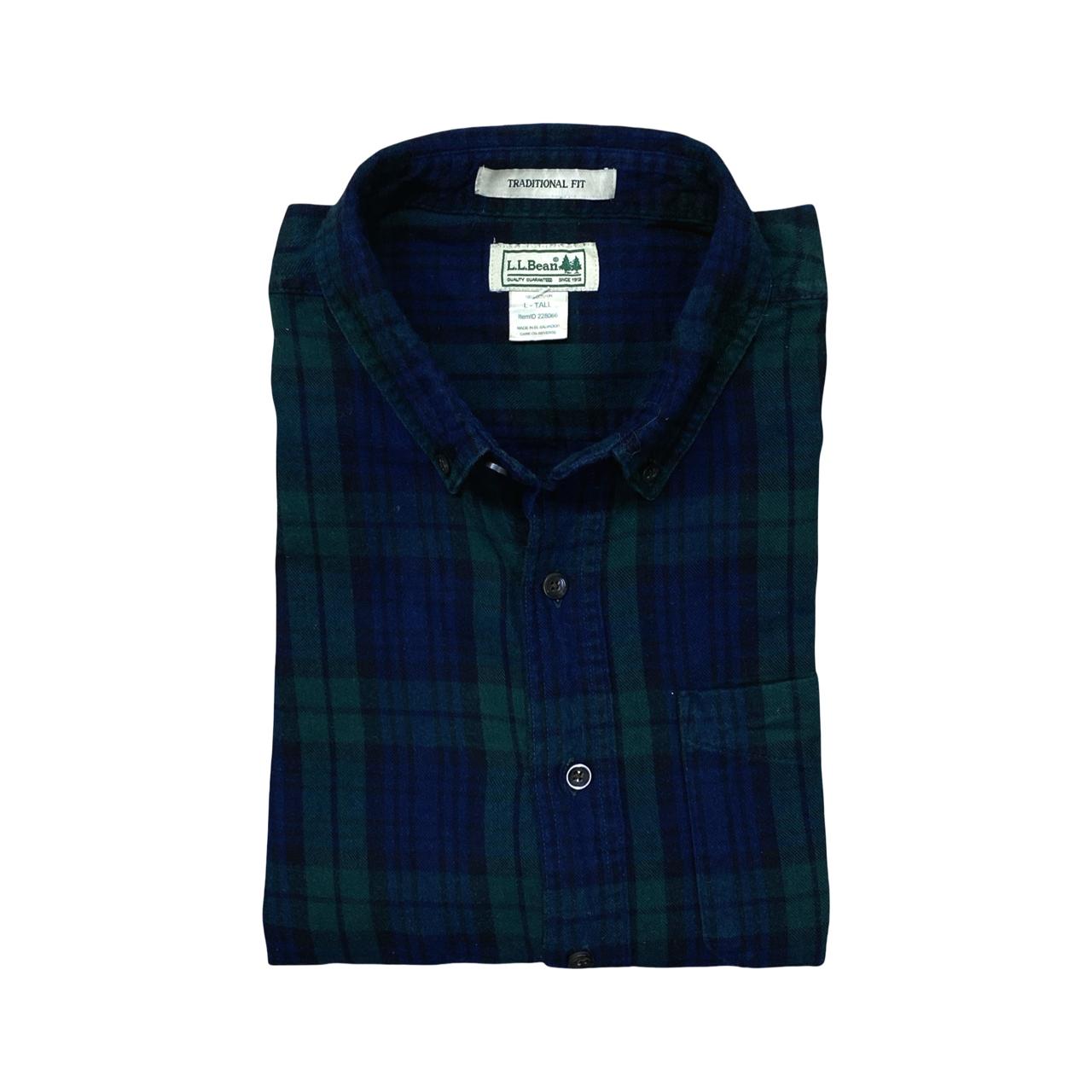 A cozy L.L. Bean flannel shirt in a deep green and navy plaid, designed in a traditional fit. Perfect for casual outings or layering in colder weather.