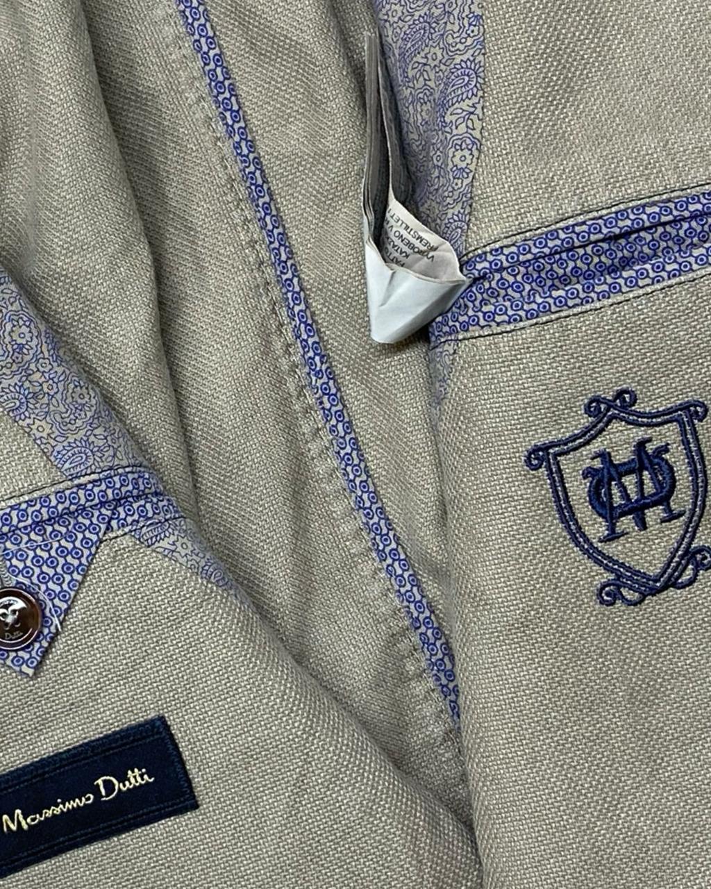 A premium casual blazer from Massimo Dutti in a soft light olive green tone. Crafted from lightweight linen with a stylish unstructured cut, it features patch pockets and contrast paisley piping details, making it a perfect choice for refined casual looks.