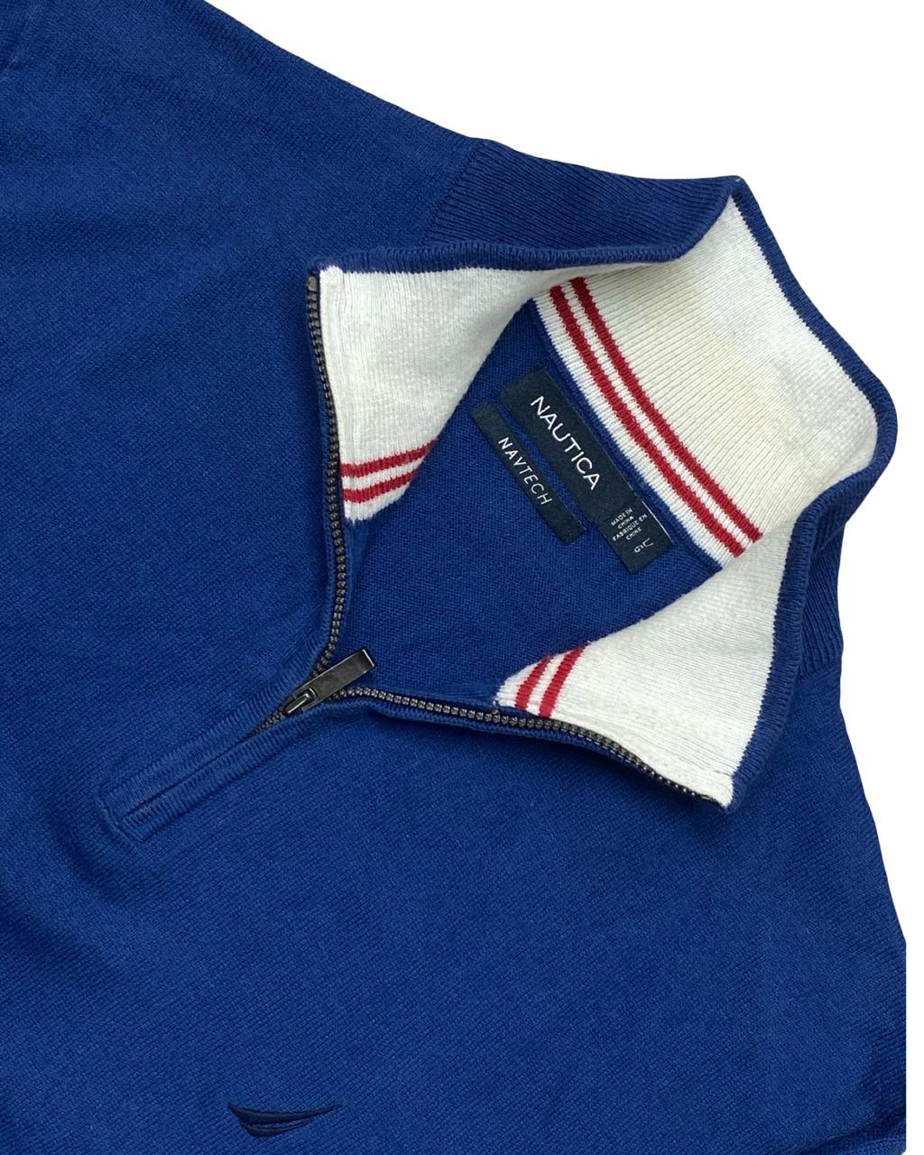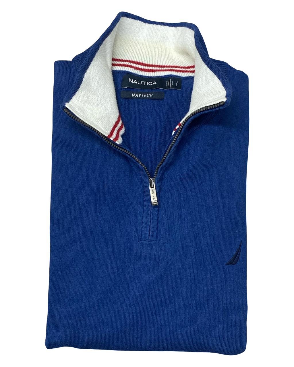 Sleek and sporty, this Nautica Navtech quarter-zip sweater is a versatile layering piece designed for both comfort and style. Featuring a bold blue hue with contrast white interior collar and red stripe detailing, it brings a nautical touch to casual wear.