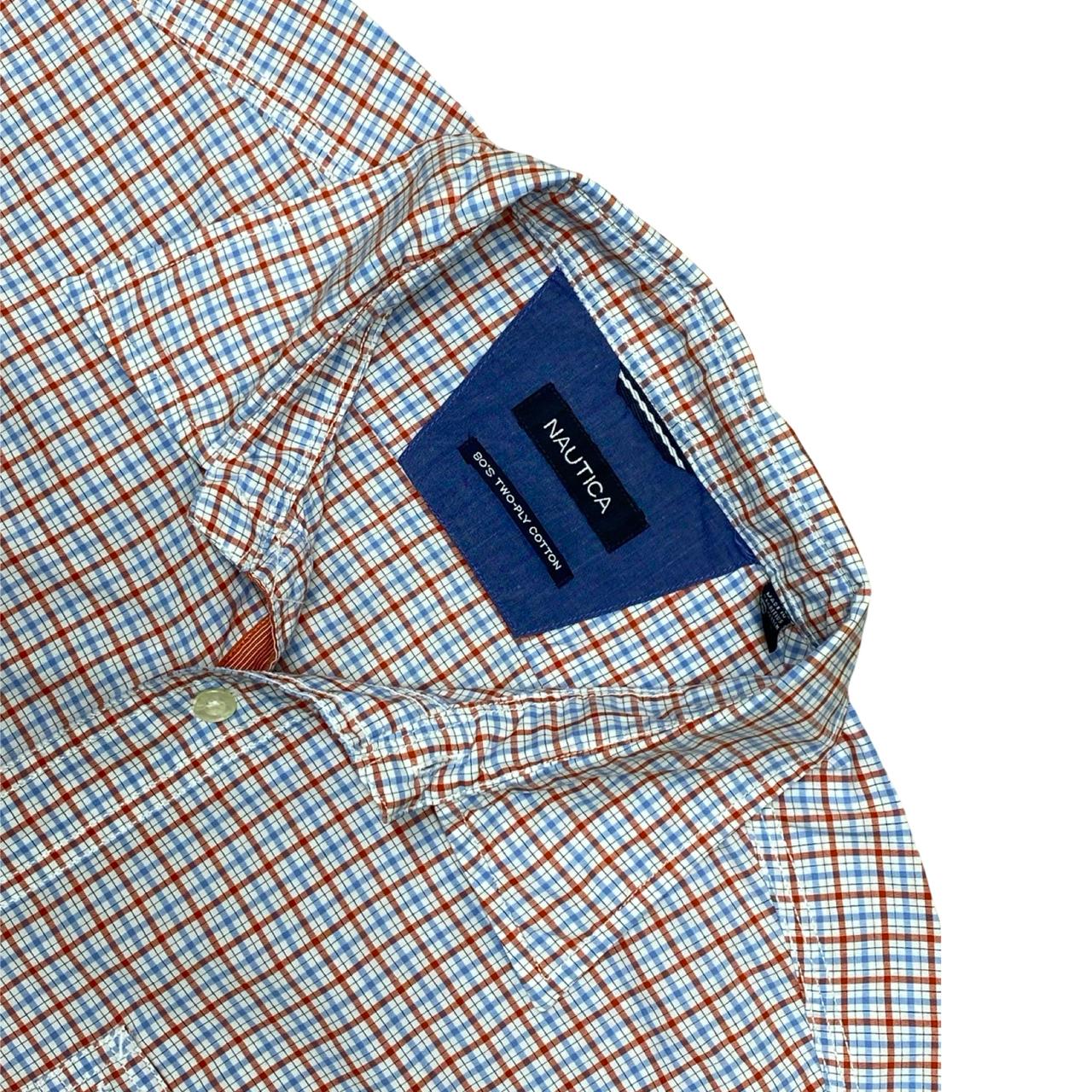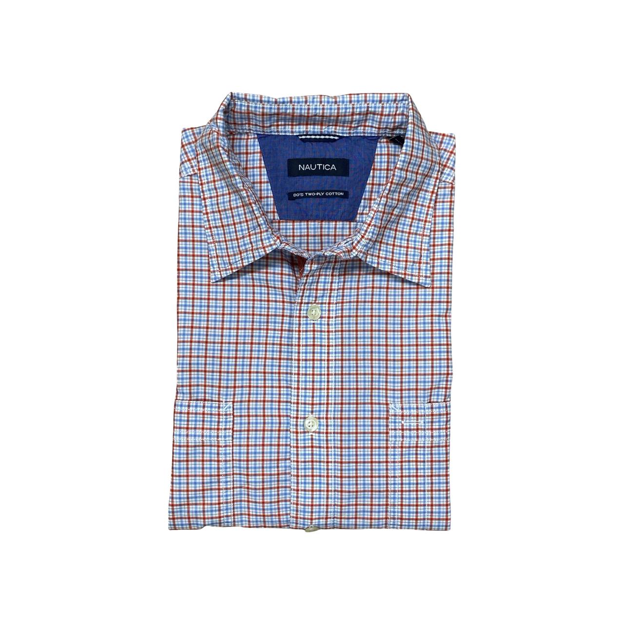 Classic Nautica long-sleeve checkered shirt in light blue and orange tones. A versatile piece that balances casual comfort with polished style.