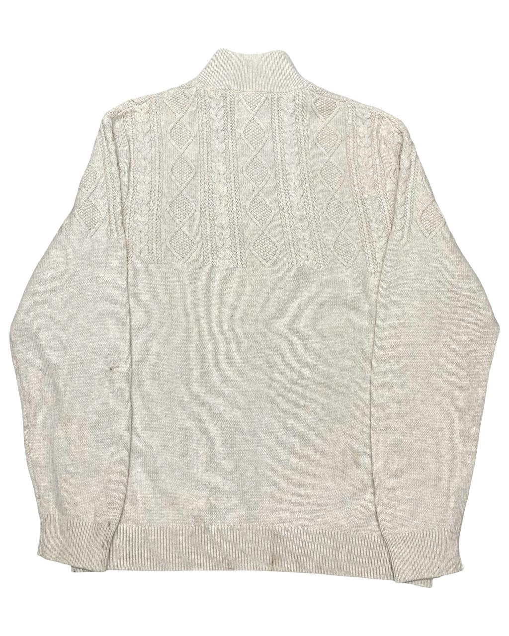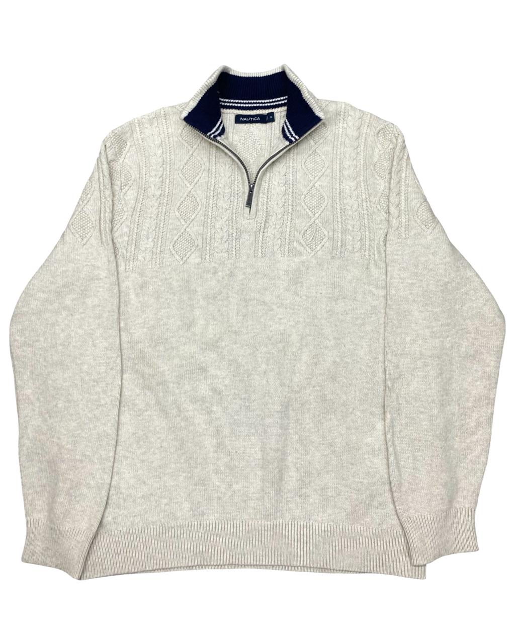Add timeless texture to your wardrobe with this Nautica 1/4 zip cable knit sweater. Featuring a classic cream color, diamond and cable knit patterns, and a bold navy striped collar, this pullover delivers both warmth and preppy appeal — perfect for chilly days, casual office looks, or layered weekend fits.