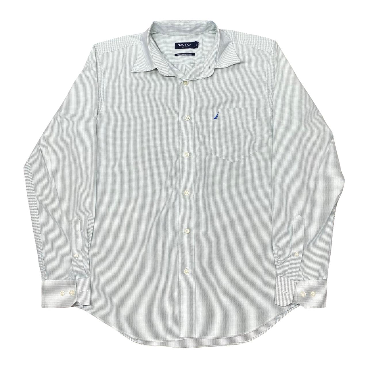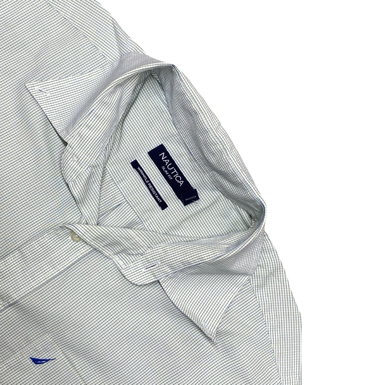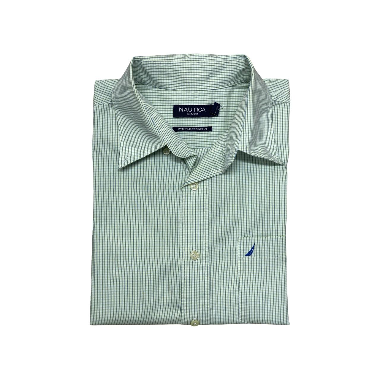 A stylish Nautica slim-fit shirt in a refreshing green micro-check pattern, wrinkle-resistant for easy wear. Crafted with long sleeves, buttoned cuffs, and a front chest pocket embroidered with the iconic Nautica sail logo. Perfect for both office wear and smart-casual outings.
