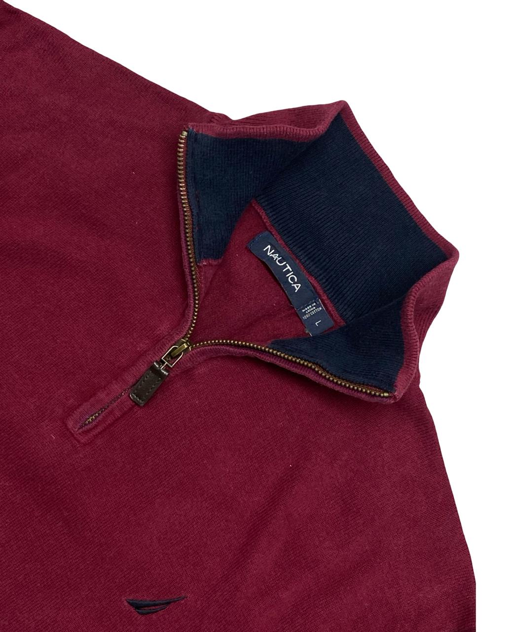 A bold essential with a touch of nautical flair, this NAUTICA quarter-zip sweater blends casual comfort with refined style. The rich maroon knit and classic sailing logo offer a timeless, collegiate vibe perfect for layering through cooler months.