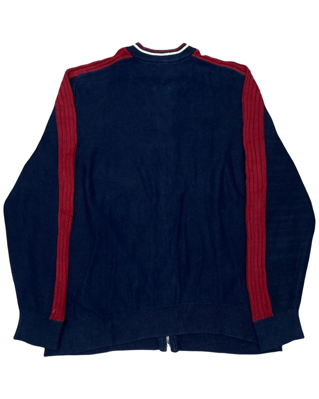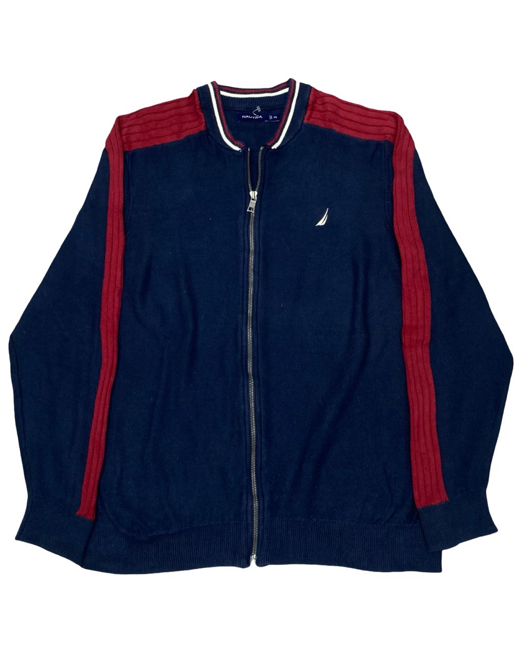 Sporty meets classic in this Nautica full-zip track-style sweater. Featuring a navy base with bold red ribbed shoulder and sleeve accents, this piece blends athletic inspiration with casual comfort. A standout layering option that adds a pop of color to your wardrobe.