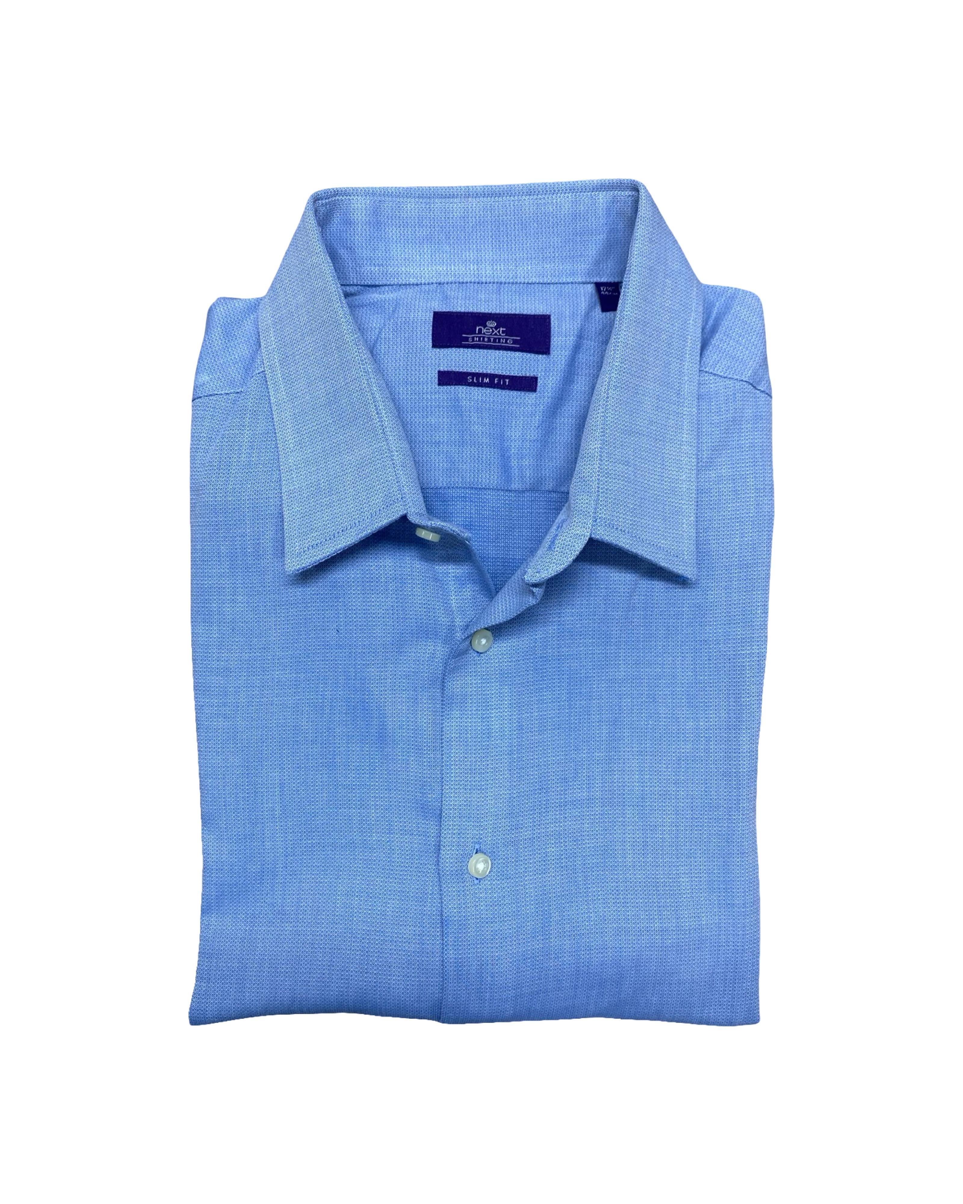 Bring refined simplicity to your wardrobe with this sky-blue textured shirt from Next. Tailored in a slim fit, it's ideal for office wear, semi-formal occasions, or smart layering under blazers and cardigans.