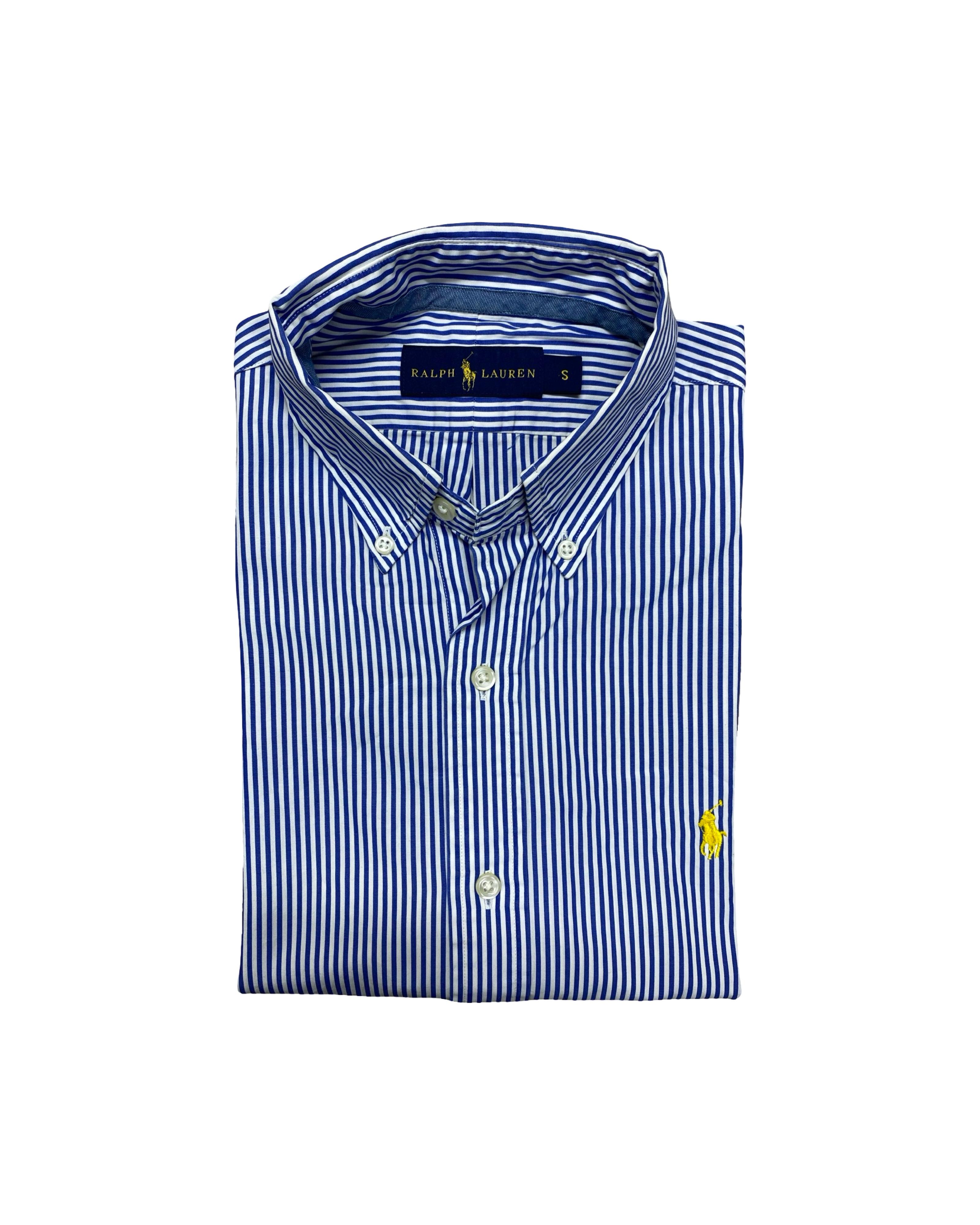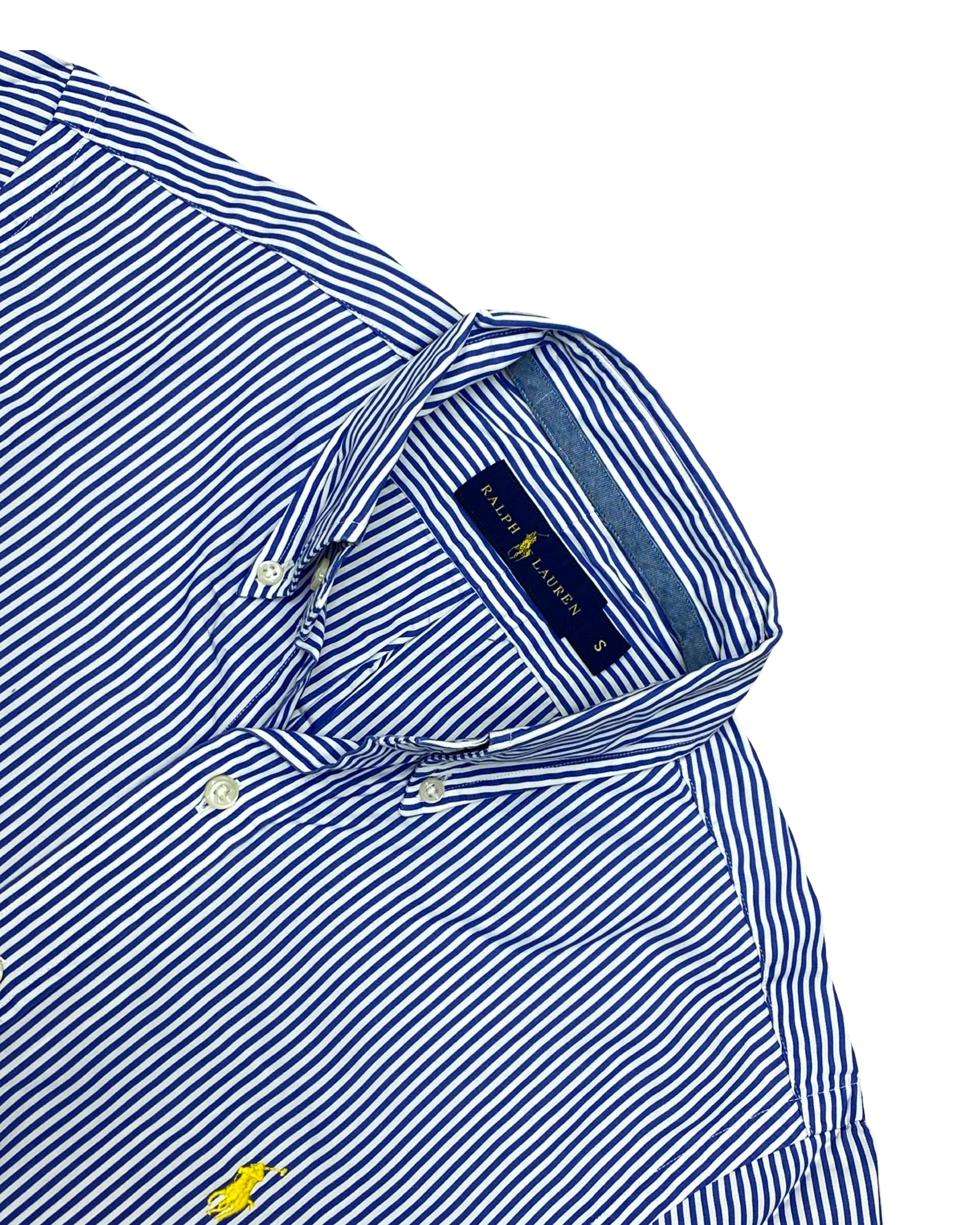Bring a pop of classic prep to your wardrobe with this Polo Ralph Lauren short-sleeve shirt in crisp blue and white vertical stripes. Featuring the iconic yellow pony logo, this shirt blends smart style with everyday comfort.