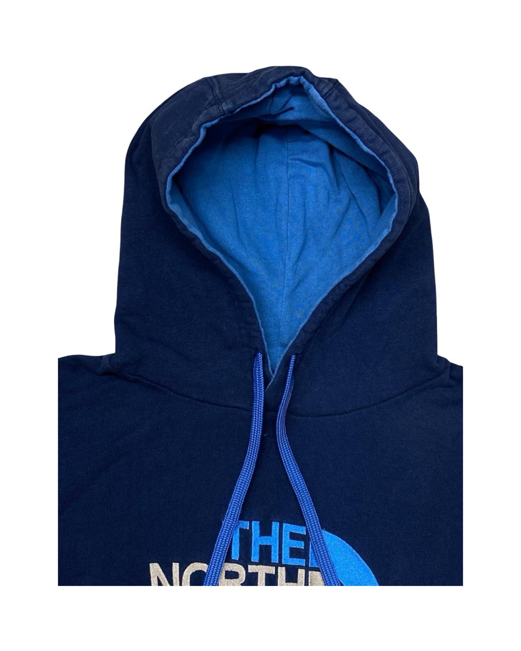 A bold and comfortable hoodie from The North Face, featuring a striking embroidered logo in white and blue on a navy base. The hoodie’s interior is lined with a contrasting lighter blue fabric, adding style and warmth. A great piece for outdoor adventures or casual layering in colder months.