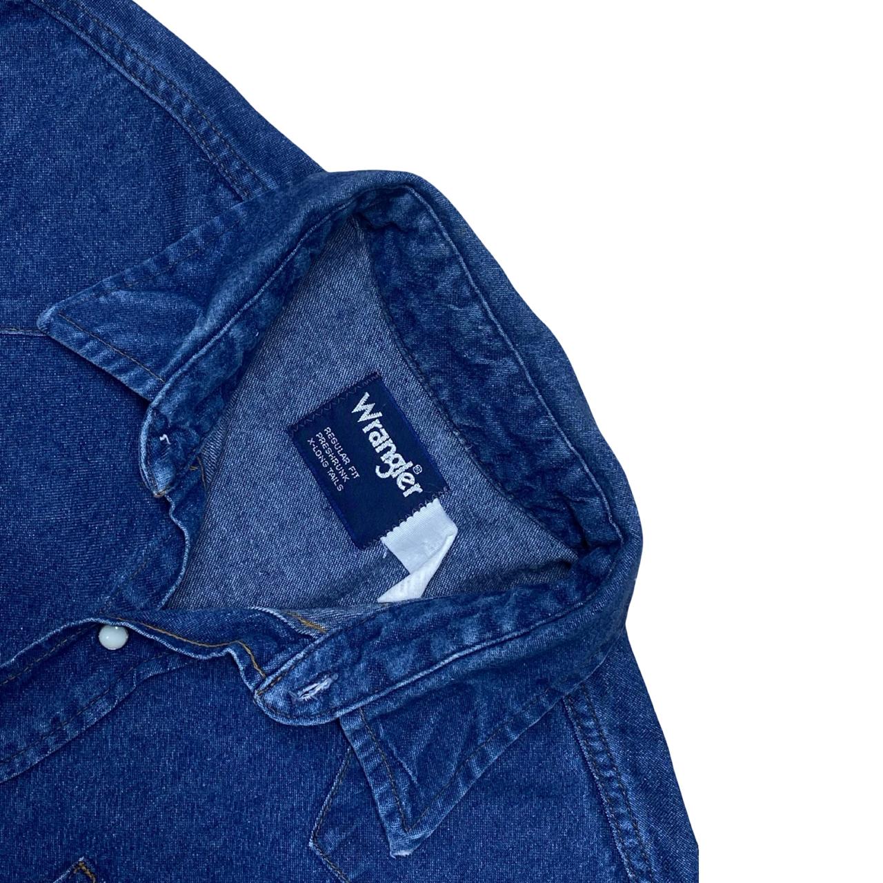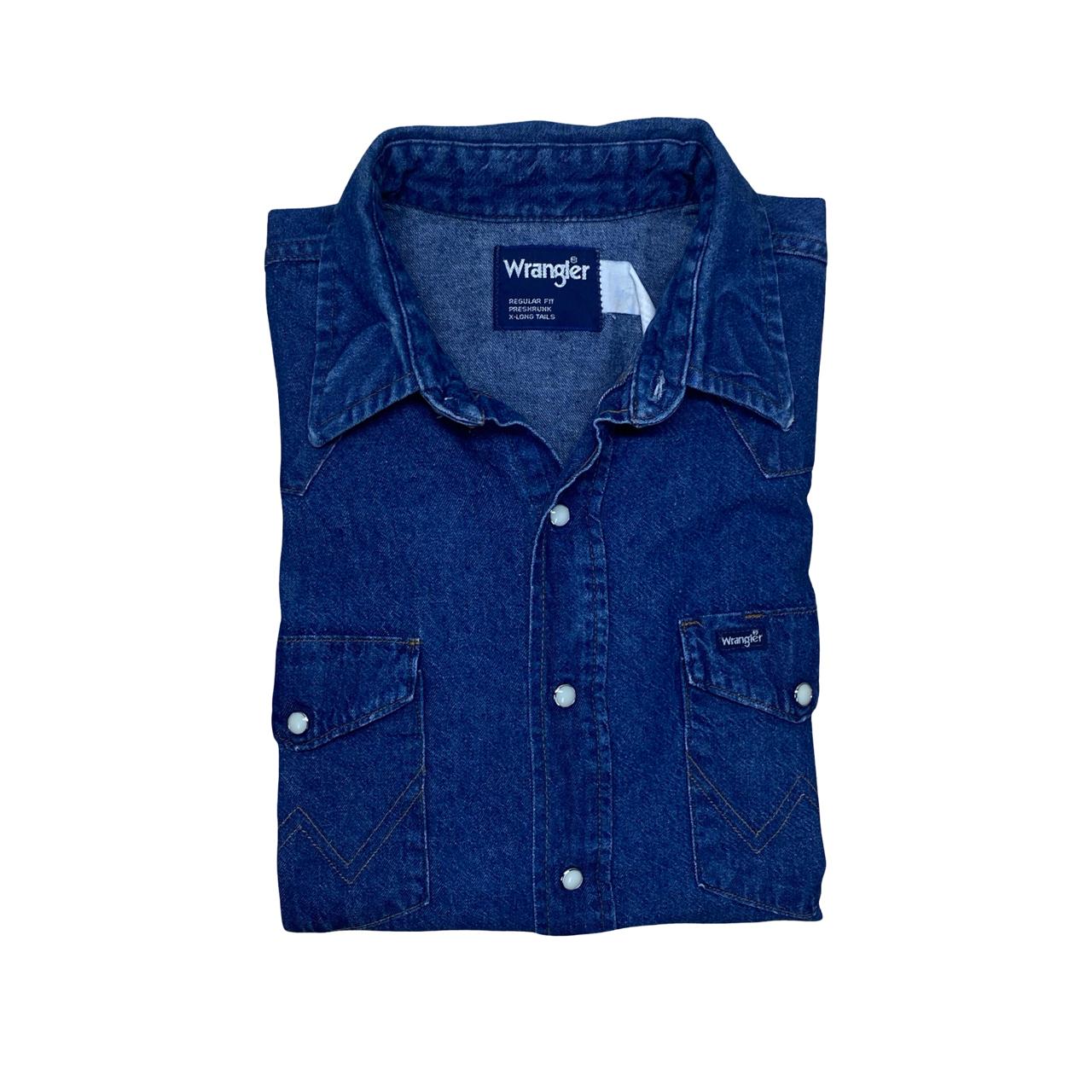 Classic Wrangler long-sleeve denim shirt in medium blue with snap button closures and dual flap chest pockets. A rugged yet versatile wardrobe essential, perfect for casual wear, layering, or pairing with boots for an authentic western look.