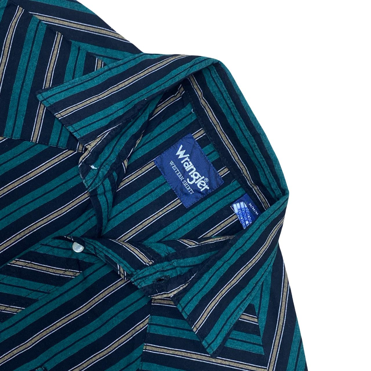 A bold Wrangler short-sleeve striped shirt with a western-inspired design, featuring dual flap chest pockets and snap button closure — perfect for casual and rugged looks.