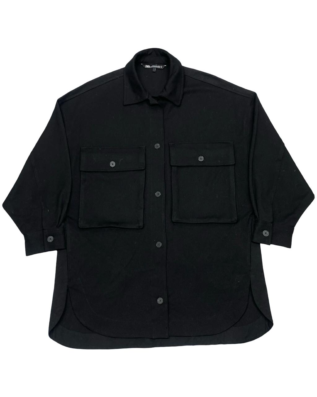 A sleek and versatile oversized black overshirt from ZARA, crafted with a minimalist utilitarian design. Perfect for layering or standalone wear, this piece delivers both style and function.