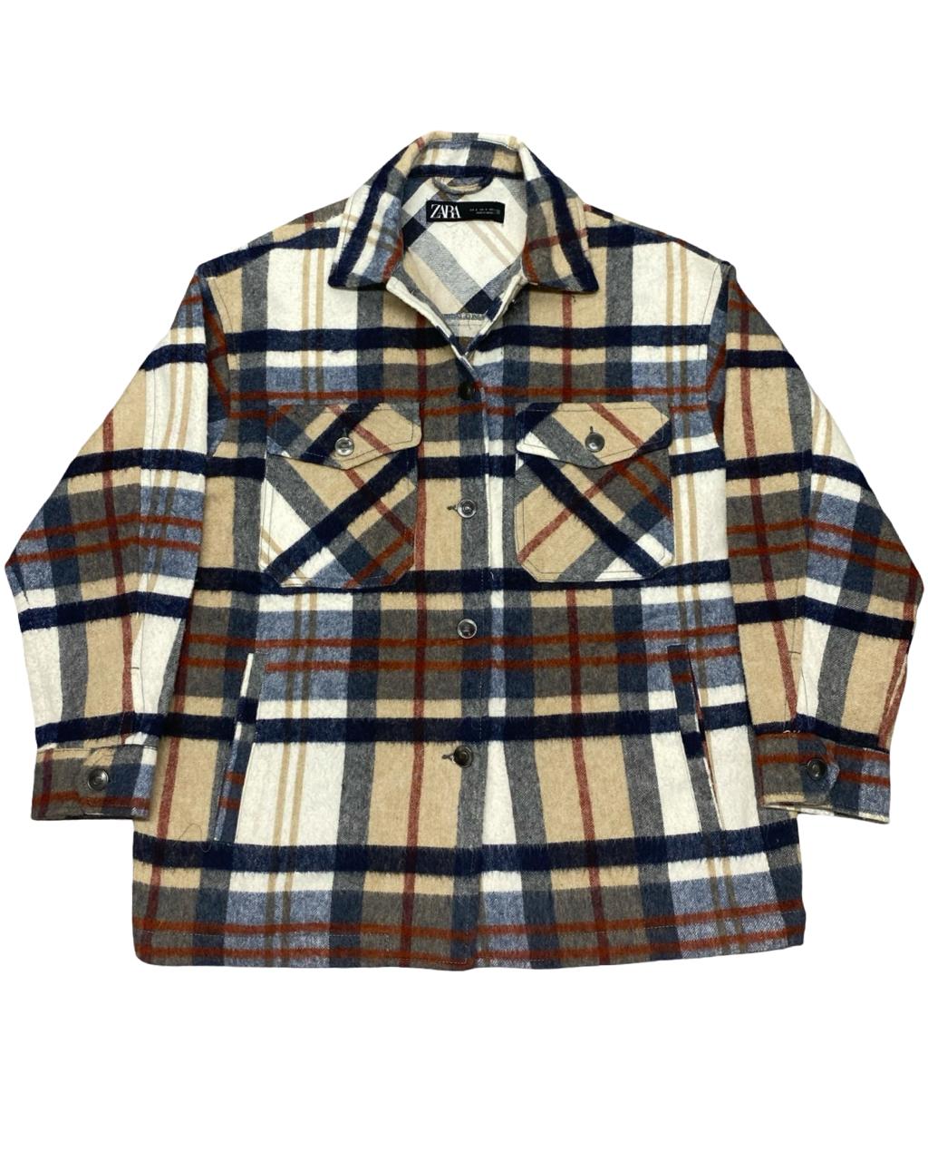 A cozy and eye-catching overshirt from ZARA, featuring a multicolor plaid pattern in beige, navy, rust, and cream tones. Perfect for layering in cooler weather, offering both comfort and standout style.